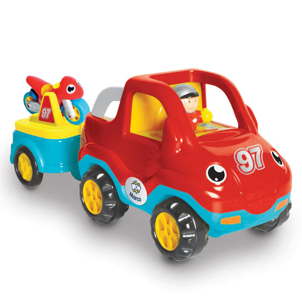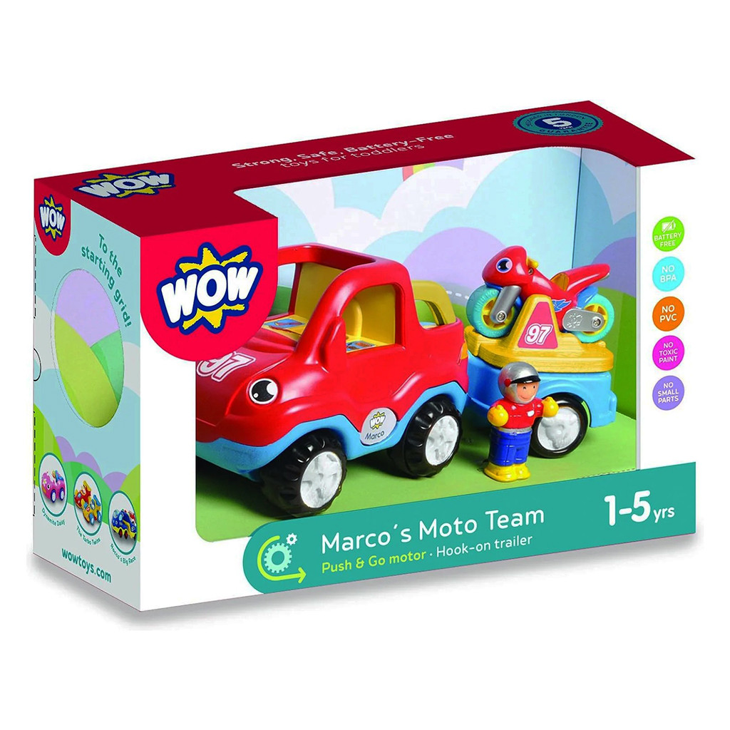 Marco Moto csapata egy barátságos és megbízható motorverseny-szállító jármű pótkocsival, nagy kerekekkel és erőteljes motorral.