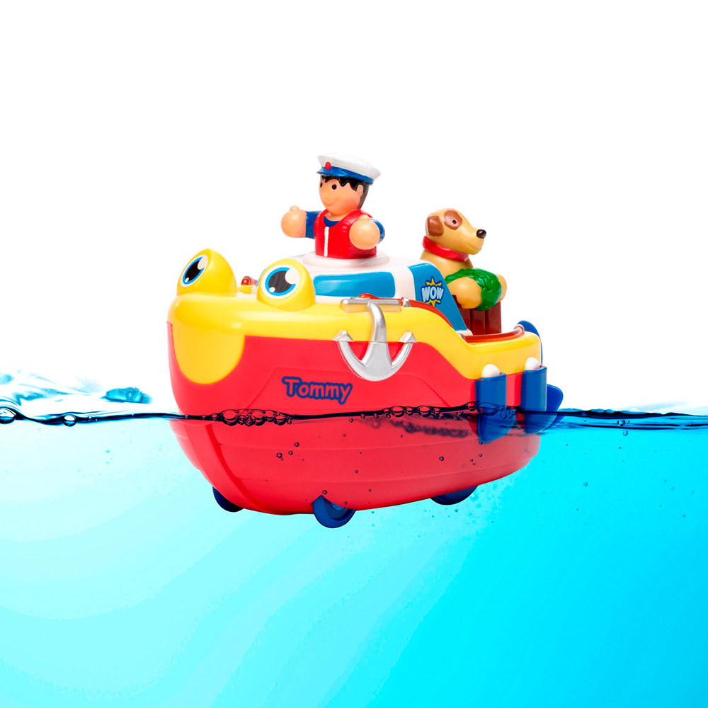 Húzd fel Tommyt, a vontatóhajót, és a hozzá tartozó kapitánnyal együtt máris száguld a vízen a motoros propellerének köszönhetően!